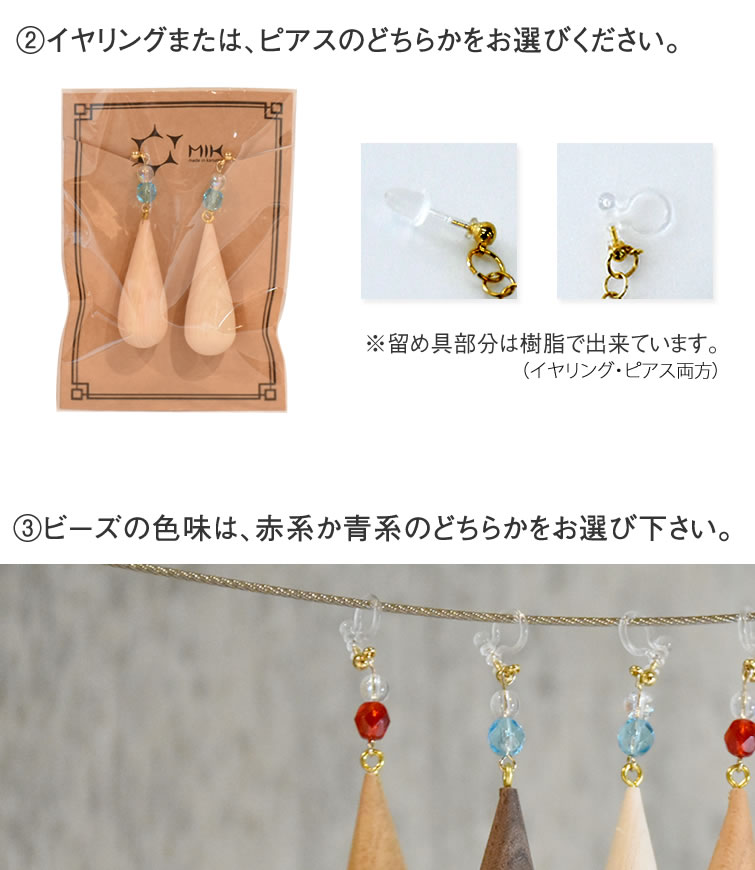 ドロップ(ビーズ付き) ピアス・イヤリング 鹿沼木工 MIK 送料無料 | 日本製 国産 アクセサリー 木製 チャーム 檜 桧 ひのき ヒノキ 父の日 お中元 プレゼント ギフト 鹿沼木工 帰省土産 お供え お土産 手土産