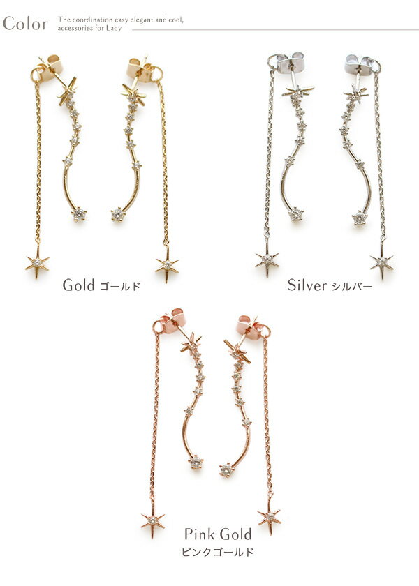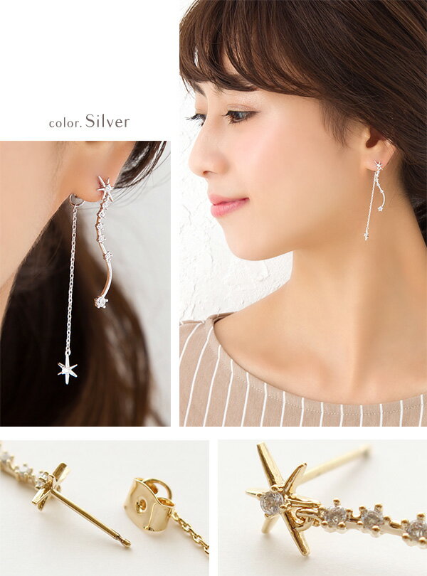 keyword : ピアス 金属アレルギー Silver925 星 流れ星 スター ロング■□ Item information - 商品説明 - □■ 緩やかなラインに星を散りばめたような流星を描いたとってもかわいいピアスです! キャッチ側にはロングチェーンと星のチャームが揺れ、輝くストーンがフェイスラインを彩ります。