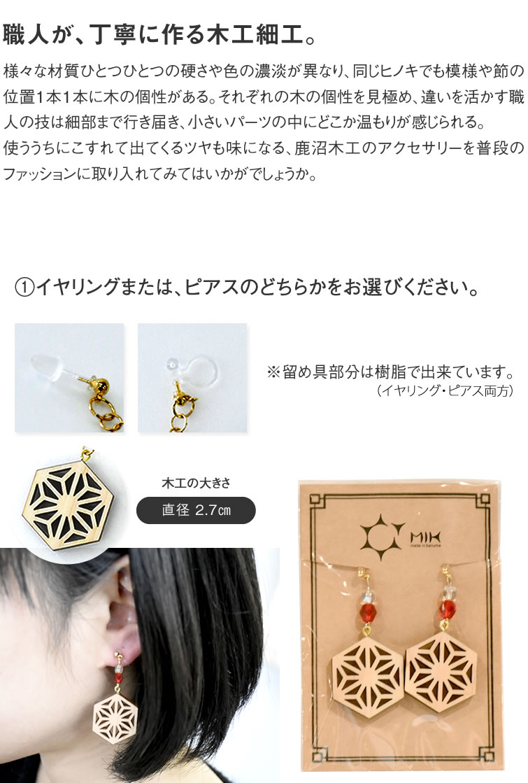 麻の葉(ビーズ付き) ピアス・イヤリング 鹿沼木工 MIK 送料無料 | 日本製 国産 アクセサリー 木製 チャーム 檜 桧 ひのき ヒノキ 父の日 お中元 プレゼント ギフト 鹿沼木工 帰省土産 お供え お土産 手土産