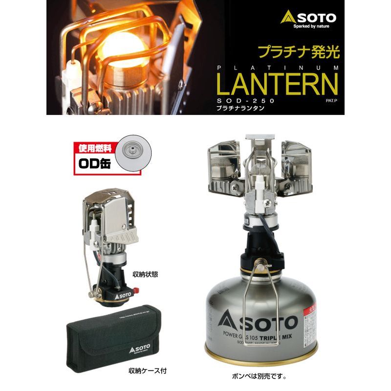 プラチナ発光は風にも強く、このリフレクターだけで 寸法 幅77mm×奥行65×高さ110mm(使用時) 幅33mm×奥行58×高さ142mm(収納時)本体のみ 重量 210g(本体のみ) 照度※1 120ルクス(80W相当)SOD-725T、SOD-710T使用時 使用燃料 SOTO製品専用容器(OD缶) 使用時間 約6.0時間(SOD-725T 1本使用時) 約2.0時間(SOD-710T 1本使用時) 点火方式 圧電点火方式 付属品 専用収納ケース ボンベは別売です。