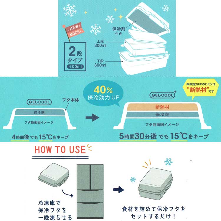 冷気はしっかり下段まで!フタの内部に保冷剤を入れたジェルクールに、新たに断熱材を加えることで従来より保冷効力を約40%アップ。