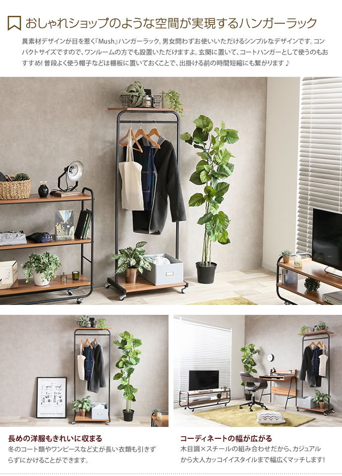 代引き代引き不可備考【梱包サイズ】90cm×47cm×10cm【商品重量】約9.5kg【耐荷重】天板 約15kg、ハンガー 約15kg【生産国】中国※プラスドライバーをご用意ください※組立時間:2人以上で約20分 【幅60cm】Mush ハンガーラック