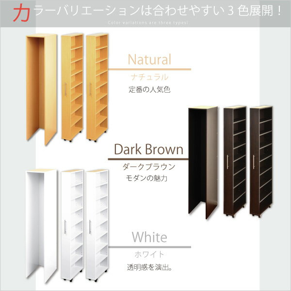 【商品について】すき間収納ラック【GaP】ラック2台+専用ケースセット■サイズ:外寸:(約)本体:外寸 幅35cmx奥45cmx高182.3cm本体:内寸 幅31cmx奥45cmx高180.5cmラック:外寸 幅15cm×奥45cm×高178.8cmラック:内寸 幅41.2cm×奥13.3cm×高41.2cm(×4)※商品重量:(約)44kg■カラー:ダークブラウン ホワイト ナチュラル■素材:パーチクルボード、中密度繊維板(MDF)表面加工:プリント紙化粧合板、PVC■その他:・お客様組立商品です・梱包サイズ:(1/3)約193x51.5x8cm(2.95才)(2/3)約188x46x6cm(1.92才)(3/3)約188x46x6cm(1.92才)・梱包総重量:(約)46kg※在庫状況や返品などについて こちらの商品はメーカー直送商品となります。