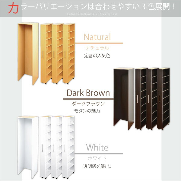【商品について】すき間収納ラック【GaP】ラック3台+専用ケースセット■サイズ:本体:外寸(約)幅50cmx奥45cmx高182.3cm本体:内寸(約)幅46cmx奥45cmx高180.5cmラック:外寸(約)幅15cm×奥45cm×高178.8cmラック:内寸(約)幅41.2cm×奥13.3cm×高41.2cm(×4)※商品重量:(約)60kg■カラー:ダークブラウン ホワイト ナチュラル■素材:材質:パーチクルボード、中密度繊維板(MDF)表面加工:プリント紙化粧合板、PVC■その他:・お客様組立商品です・梱包サイズ:(1/4)約193x51.5x8cm(2.95才)(2/4)約188x46x6(1.92才)(3/4)約188x46x6(1.92才)(4/4)約188x46x6(1.92才)・梱包重量:(約)62.5kg