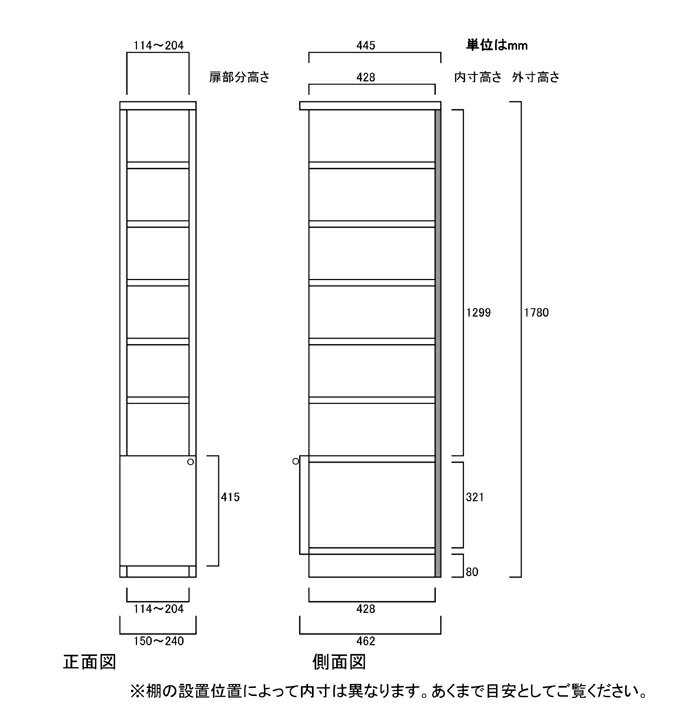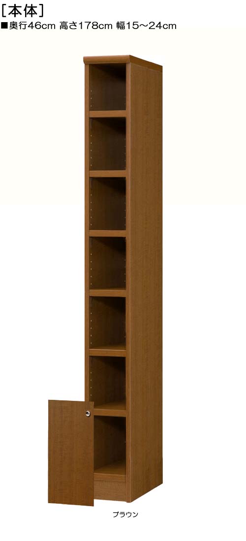 スペースにピッタリサイズでオーダー可能 扉付オーダー本棚 厚棚板(厚さ2.5cm) 奥行46cm×高さ178cm×幅15〜24cm 扉高41.5cm 幅1cm単位指定 扉付 棚板厚2.5cm 奥行46cm 高さ178cm 幅15〜24cm 扉高41.5cm お客様組立 低ホルムアルデヒド ご注意 オプション加工を選択されても価格が自動計算されません。